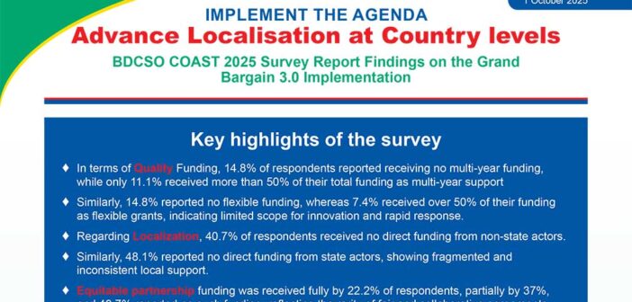 BDCSO COAST is a network of local and national NGOs in Bangladesh that became a signatory to the Grand Bargain in March 2025. As part of the 2025 yearly reporting process to track the progress of localization in the country, the network launched a survey to capture the real-time status of the Grand Bargain Agenda. The survey reveals significant gaps in funding, localization, participation, gender responsiveness, risk-sharing, and anticipatory action. To know more, please find the full report click here